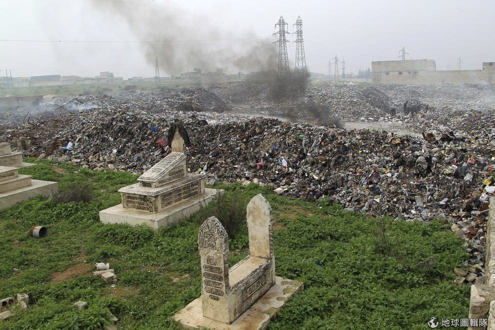 照片中的地點是敘利亞的大城阿勒坡,一位撿垃圾的民眾走在墓園和垃圾場間。