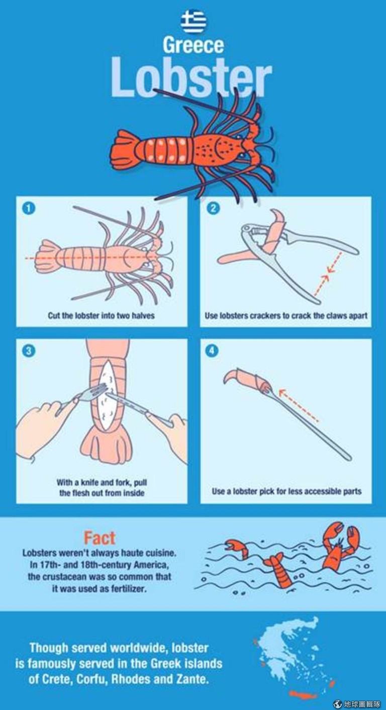 小秘密:龍蝦不一定是高級料理。在17到18世紀的美國,像龍蝦這樣的甲殼類動物太常見,以致於龍蝦曾被當作肥料使用。雖然全球都吃得到龍蝦,但希臘克里特島、科孚島、羅德島和扎金索斯州的龍蝦特別有名。