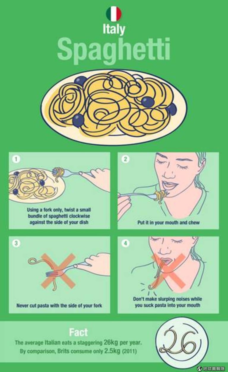 小秘密:義大利人平均每年每人吃下26公斤的義大利麵,而英國人在2011年每人只吃了2.5公斤而已。