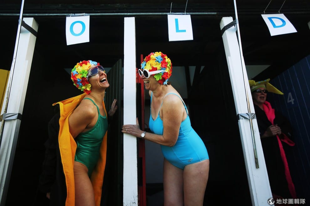 參加冬泳錦標賽的民眾開心大笑,這場在英國Tooting Bec Lido舉辦的冬泳競賽相當知名,吸引許多民眾換上五花八門的泳裝參賽。