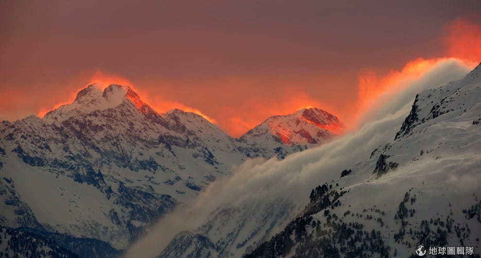 瑞士聖莫里茨(St. Moritz)的山上反射出美麗的夕照光芒。