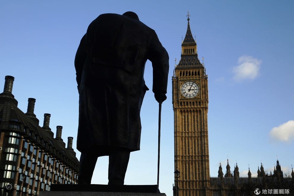 照片中的倫敦國會前方,可見英國已故前首相邱吉爾的雕像剪影。1月24日這天,是邱吉爾逝世50周年紀念日。