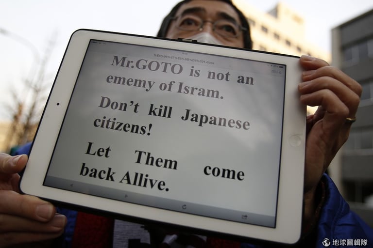 CNN25號報導,強忍著眼淚,石堂順子(Junko Ishido)站在數十架攝影機面前,她的兒子後藤健二(Kenji Goto)和另一名日本人湯川遙菜(Haruna Yukawa)遭到恐怖組織伊斯蘭國綁架,要求日本付2億美金來贖回人質。