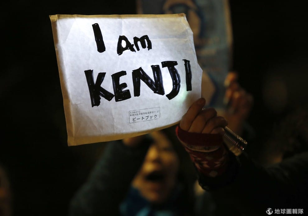 照片中可以見到聲援被綁架人質後藤健二(Kenji Goto)的民眾,拿著「我是健二」的標語(註:靈感推測來自日前法國雜誌《查理周刊》遭屠殺事件,當時聲援民眾是舉起「我是查理」的標語)。
