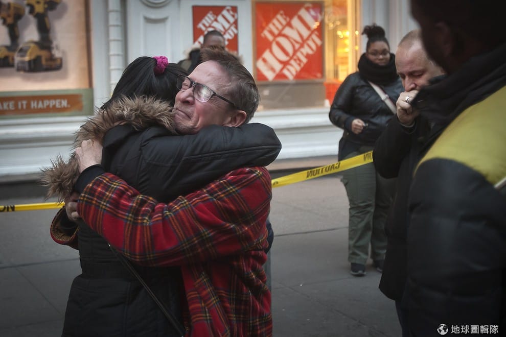 紐約市區內,剛結束槍擊驚魂的人們忍不住緊緊相擁。