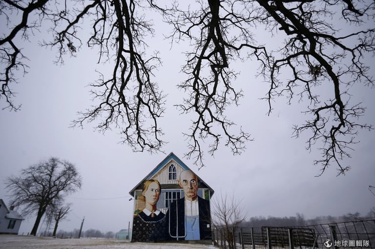 愛荷華州的一處牧場,可以見到畫家Mark Benesh把知名的畫作《美國歌德式》(American Gothic)復刻在農舍上。