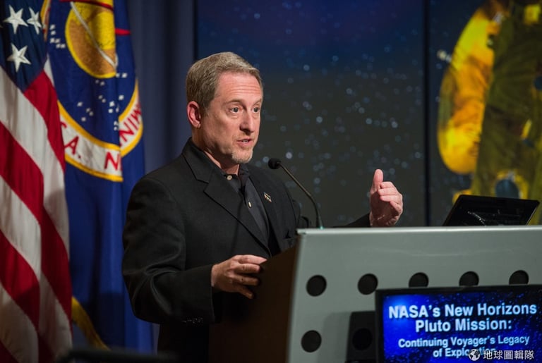 NASA新視野號計畫主持人史登博士正在講解拍攝冥王星的任務。Photo credit: NASA HQ PHOTO