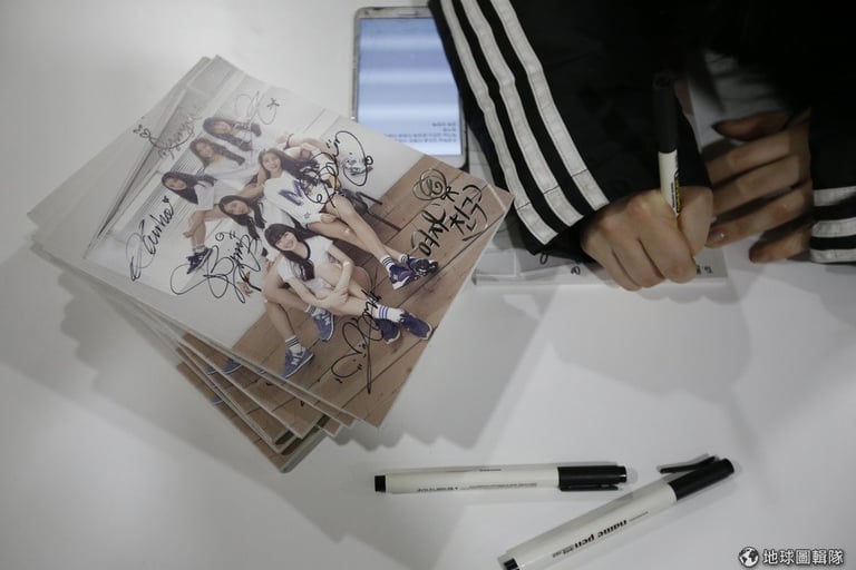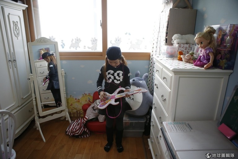 為了表演,她穿著有鑽石圖樣的長版上衣,搭配緊身黑色貼腿褲,頭上也戴著流行感十足的棒球帽;進一步看到她的書桌時,你會發現許多韓國團體的照片,鉛筆中還有麥克風放在期間,一旁角落也有把粉紅吉他靠在牆角,衣櫥內還有雙白色花邊裝飾的黑色高跟鞋。