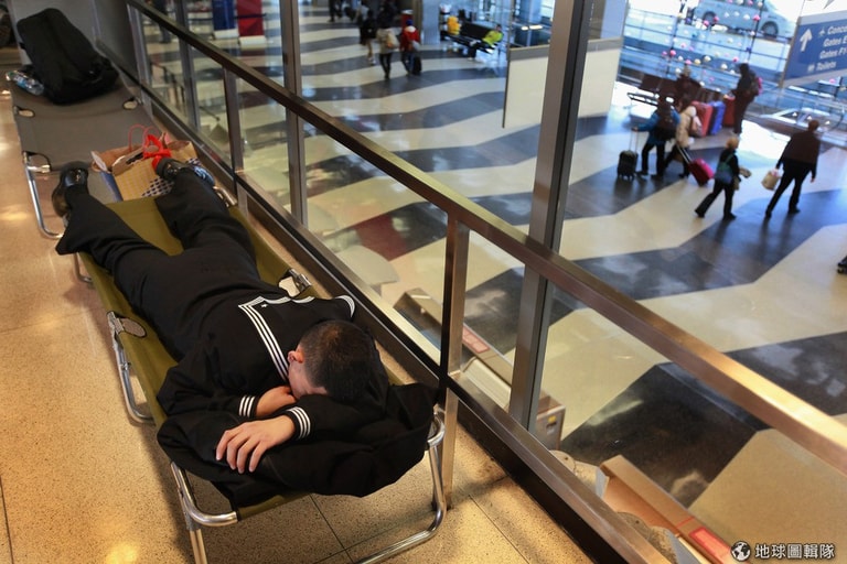 等著等著,就在機場椅子上打盹起來...。圖片來源:Scott Olson/Getty Images