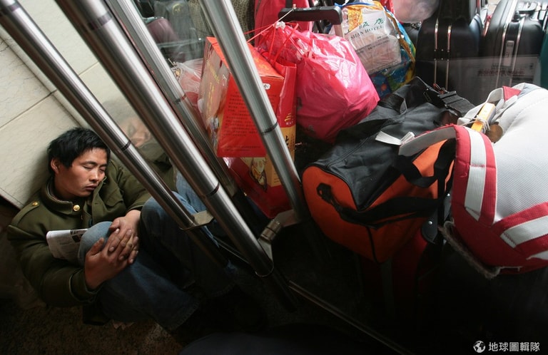 北京地鐵站內,大家揹著家當、扛著伴手禮回家去!圖片來源:Guang Niu/Getty Images