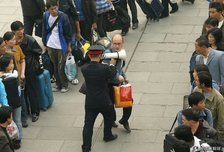 中國大陸有名的「春運」場面,每到過年前後必定上演!人山人海中可見一位想要插隊而被警察勸阻的男子。圖片來源:China Photos/Getty Images