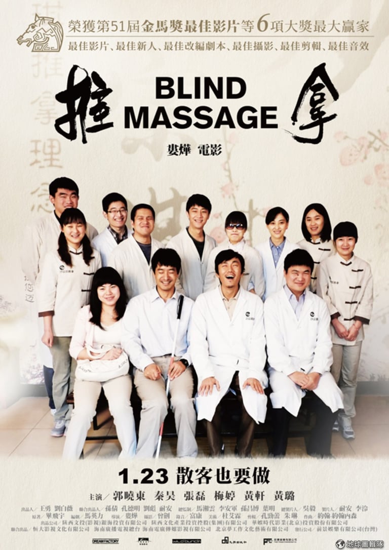【推拿】改編自曾獲茅盾文學獎的作家畢飛宇的同名暢銷小說,描述一間盲人推拿會所中男女按摩師之間的愛情與生活故事。