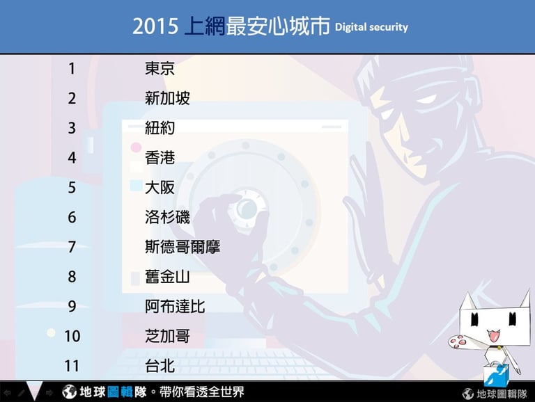 一座城市的數位科技安全(Digital security)與否,是從市民能否安全使用網路或是數位服務來看,例如該城市對網路安全的努力程度(加分),或是多常發生身分被盜(減分)等等。台北市在數位科技的安全度上,排名第11。
