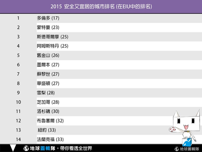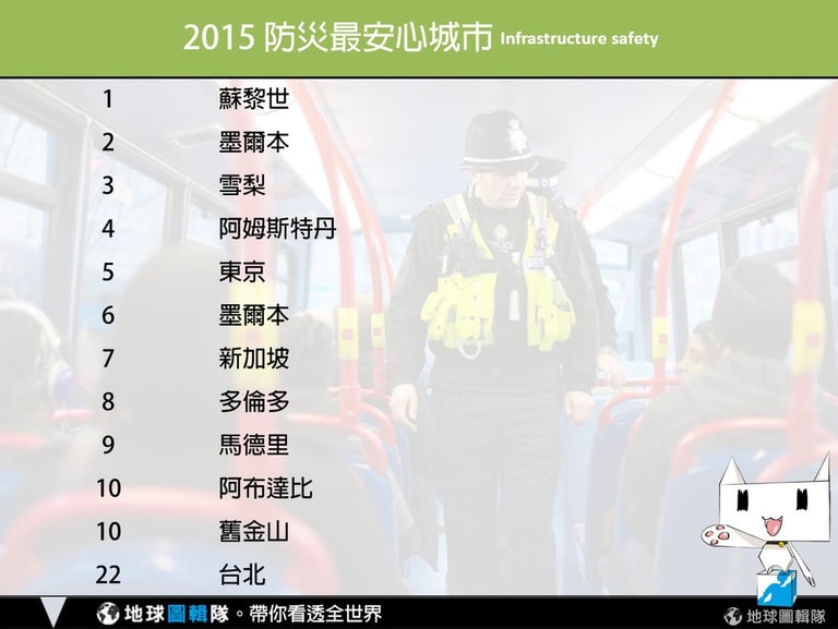 編註01:對《經濟學人》發布的安全城市報告有興趣的朋友,請至 "THE SAFE CITIES INDEX 2015"