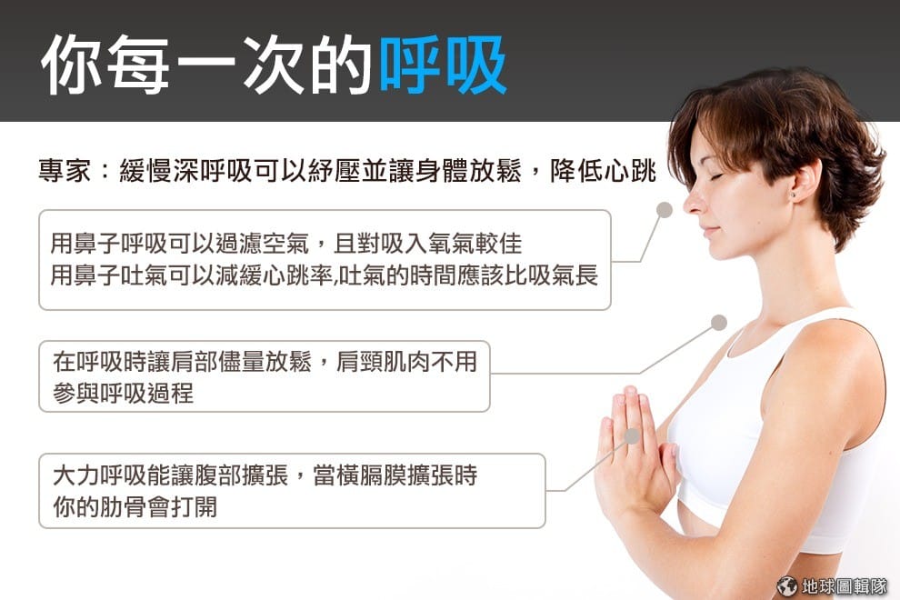而腹式或是橫膈膜呼吸則常在瑜珈或冥想課中見到。專家指出,吸氣時空氣應該經過鼻腔,而且呼氣應該比吸氣的時間久。
