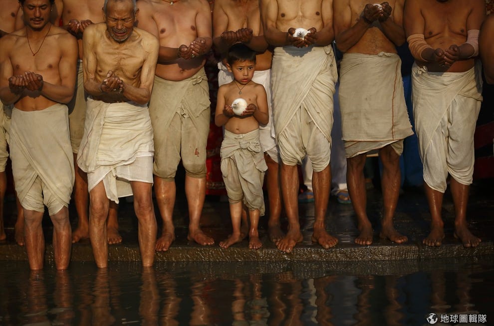 「斯瓦斯阿尼節」(Swasthani Brata Katha festival)的最後一天,信眾站在哈努馬特河邊祈禱。