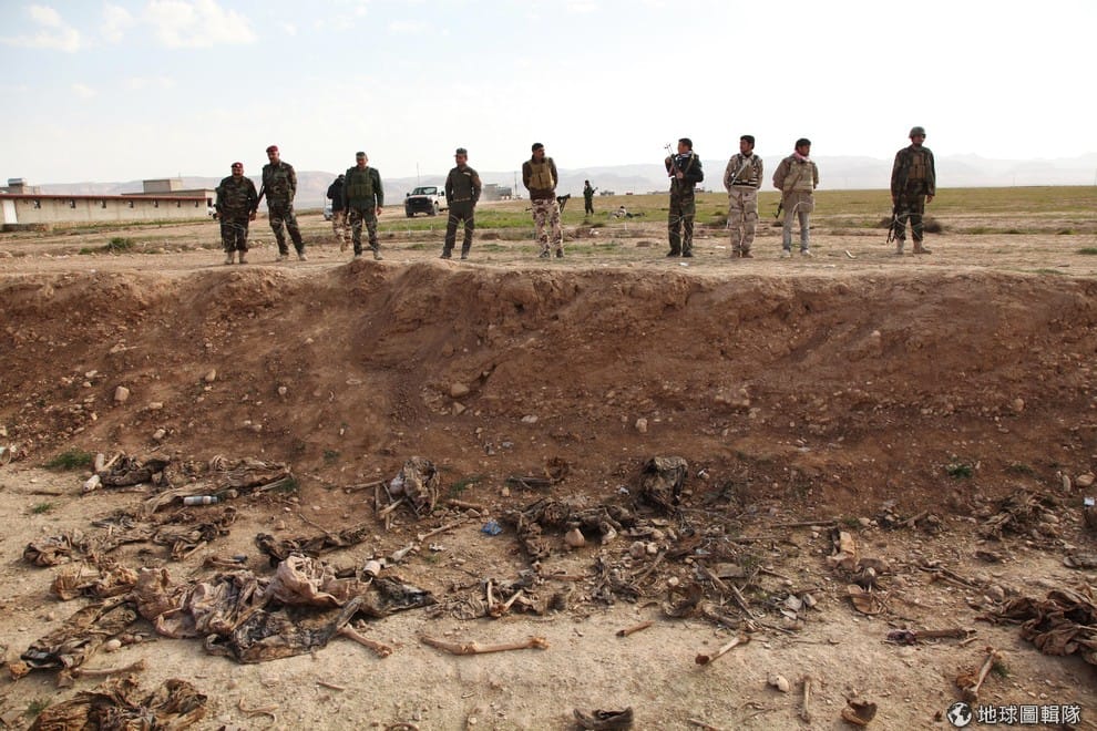 庫德人的安全部隊自由戰士(Peshmerga,原意是「面對死亡者」)看著大型墓穴裡的骸骨。警察表示,大型墓穴裡有25具亞茲迪人的屍體,這些亞茲迪人明顯是遭到伊斯蘭國殺害。亞茲迪人是當地的少數民族,因為宗教信仰不同遭到恐怖組織伊斯蘭國迫害。