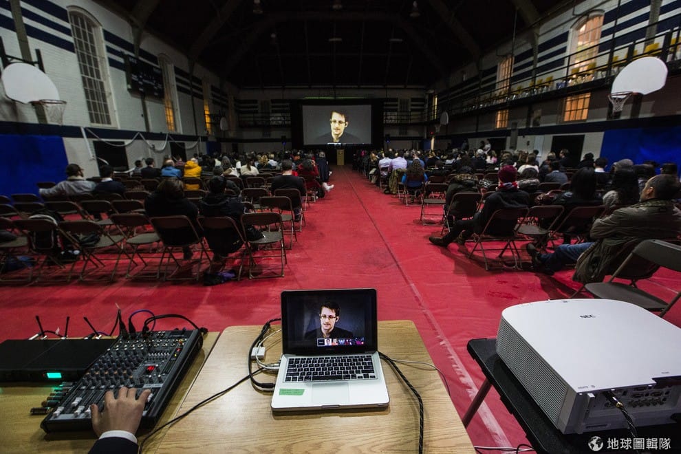 由學生策劃的國際事務會議上,可以看到美國的前任國安局(NSA)員工斯諾登(Edward Snowden)正以現場連線的方式演講。