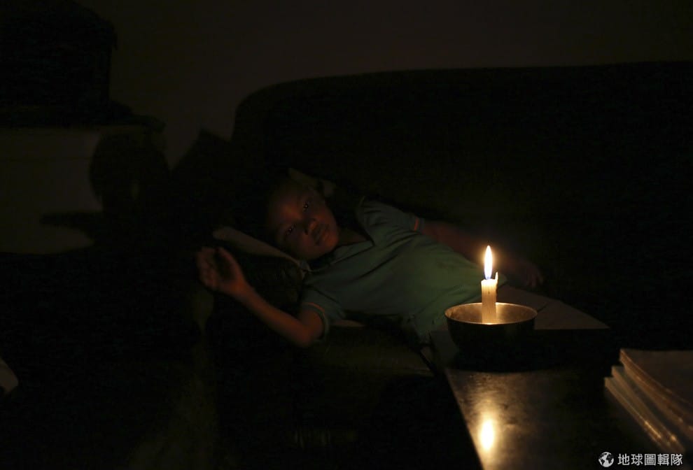 停電期間,胡甘尼(Yonga Bhungane)躺在蠟燭旁邊。南非的國營電力公司艾斯坎(Eskom)宣布3號的下午 3點到晚上 8點停電。