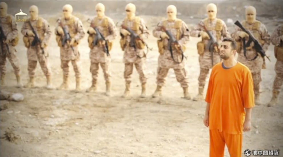照片中身穿橘色裝束的是確認被燒死的約旦空軍卡薩斯貝(Muath al-Kasaesbeh)。