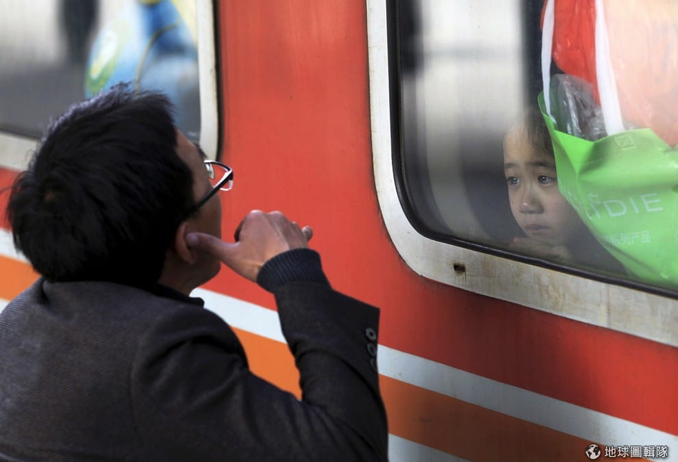 深圳的火車站裡,一名男人對女兒做出打電話的手勢,他的女兒正準備要和媽媽回湖南省的老家過年。根據《新華社》報導,中國的新年假期從 2月4日開始放到 3月16日,中國交通部預期在 40天的假期裡,會有超過 28億人搭車旅行。