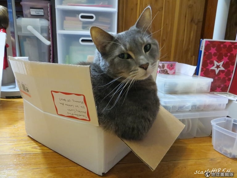 對,沒錯,就是箱子,各種箱子無論是大箱子、小箱子、奇形怪狀的箱子,只要是箱子就行了。你可以把箱子放在地上、椅子上或書架上,然後你就會看到喵星人很快地蹲進去。嗯,所以為什麼那個雅虎拍賣的空箱子對貓咪會有這麼莫名的吸引力?