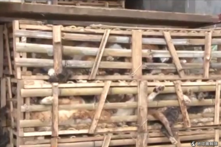 上千隻被塞在竹籠裡的走私「肉用貓」經警方查獲後,下場還是死路一條。 取自Youtube