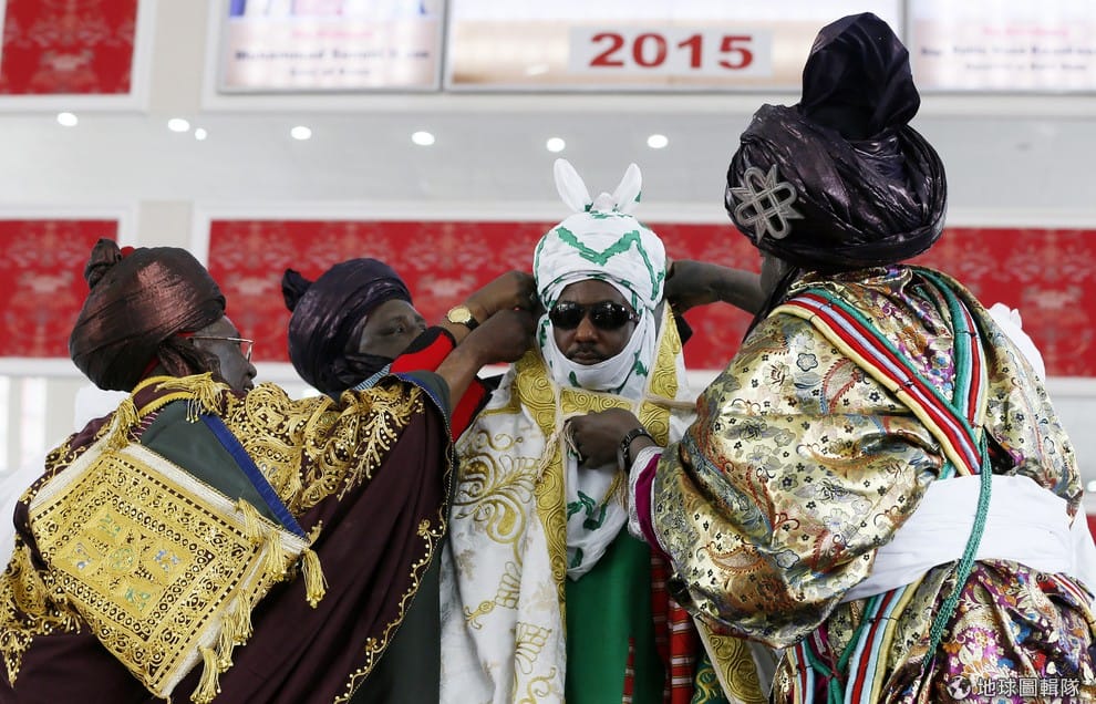 「國王造型師」正在替卡諾市的新任埃米爾「薩努西二世」(中,Muhamadu Sanusi II)更衣,為接下來的加冕典禮做準備。國王造型師在當地是專門幫領導人打理正式場合服裝的人。
