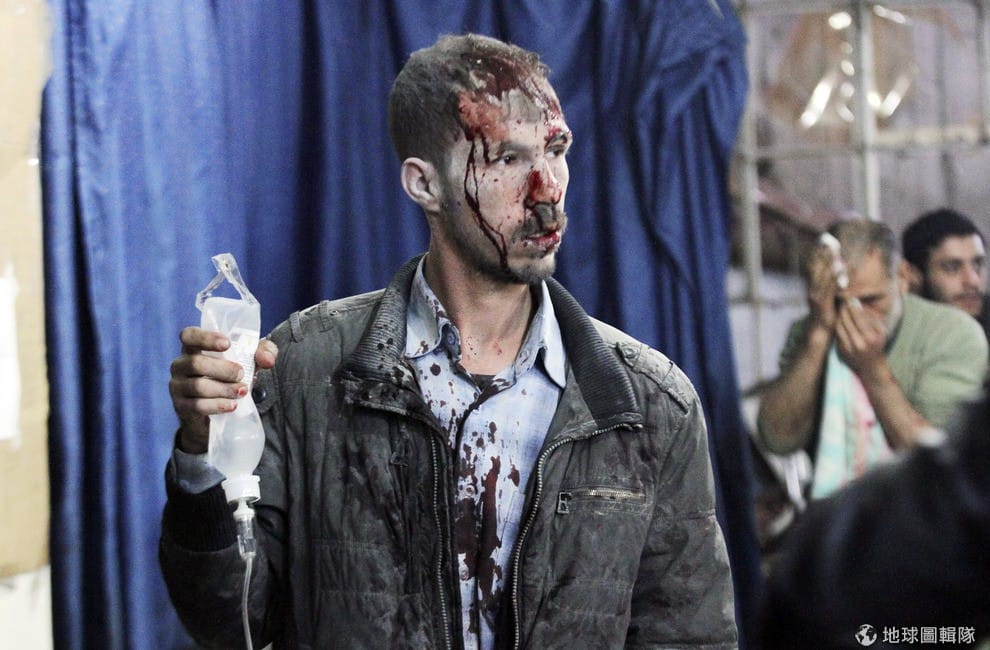 戰地醫院裡,滿臉鮮血的男人替另一名受傷的民眾拿著血清袋,當地的民運組織表示,敘利亞的大馬士革遭到效忠敘利亞總統阿薩德的軍隊轟炸。