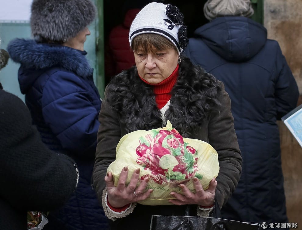 東烏克蘭的難民手裡抱著一袋的食物,其他的難民排隊等著領捐贈的救援物資。德國總理梅克爾(Angela Merkel)在 7號時下令送武器給烏克蘭政府,幫助他們對抗親俄派民兵。梅克爾日前和法國總統歐蘭德(Francois Hollande)提出烏克蘭和平計畫,但她也表示不確定這個計畫會不會被接受。