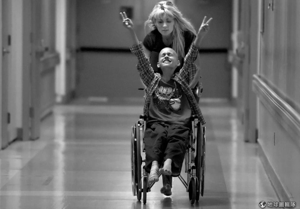 事件:照片中光著腳丫推輪椅的是法蘭區‧辛蒂(Cyndie French),前方的是她10歲的兒子德瑞克(Derek Madson),德瑞克得了罕見的神經母細胞瘤,正等著做脊髓穿刺檢測,這次的檢測結果將決定他符不符合幹細胞移植的資格。脊髓穿刺的劇痛、還有可能不符資格的害怕...種種情緒壓迫著年僅10歲的德瑞克,辛蒂為了讓她的寶貝不要緊張,就用力的在醫院走廊上快速推起輪椅,德瑞克也興奮地舉起雙手。這珍貴的一刻恰好被攝影師記錄下,瑞妮為這對母子所做的攝影紀錄也得到2007年普立茲「特寫攝影獎」。