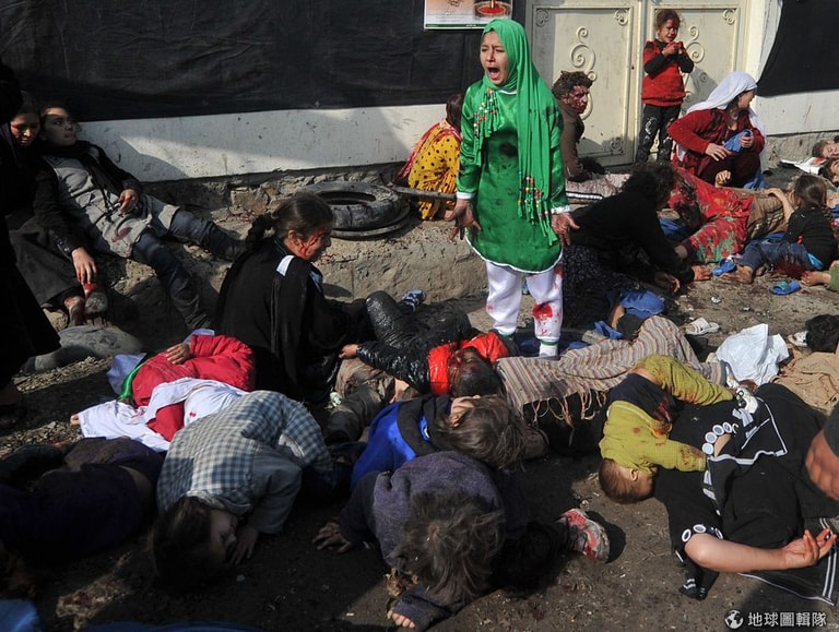 事件:2011年,一名自殺炸彈客衝進了擠滿人群的清真寺內,當時正是伊斯蘭教盛大的「阿舒拉」節,炸彈客引爆後造成許多人當場死亡或重傷。一名喀布爾當地的小女孩,全身沾滿血跡的站在死傷人群中,不停嚎哭...。這驚心動魄的一刻被攝影師馬桑記錄下,並為他贏得2012年普立茲「突發新聞攝影獎」獎。