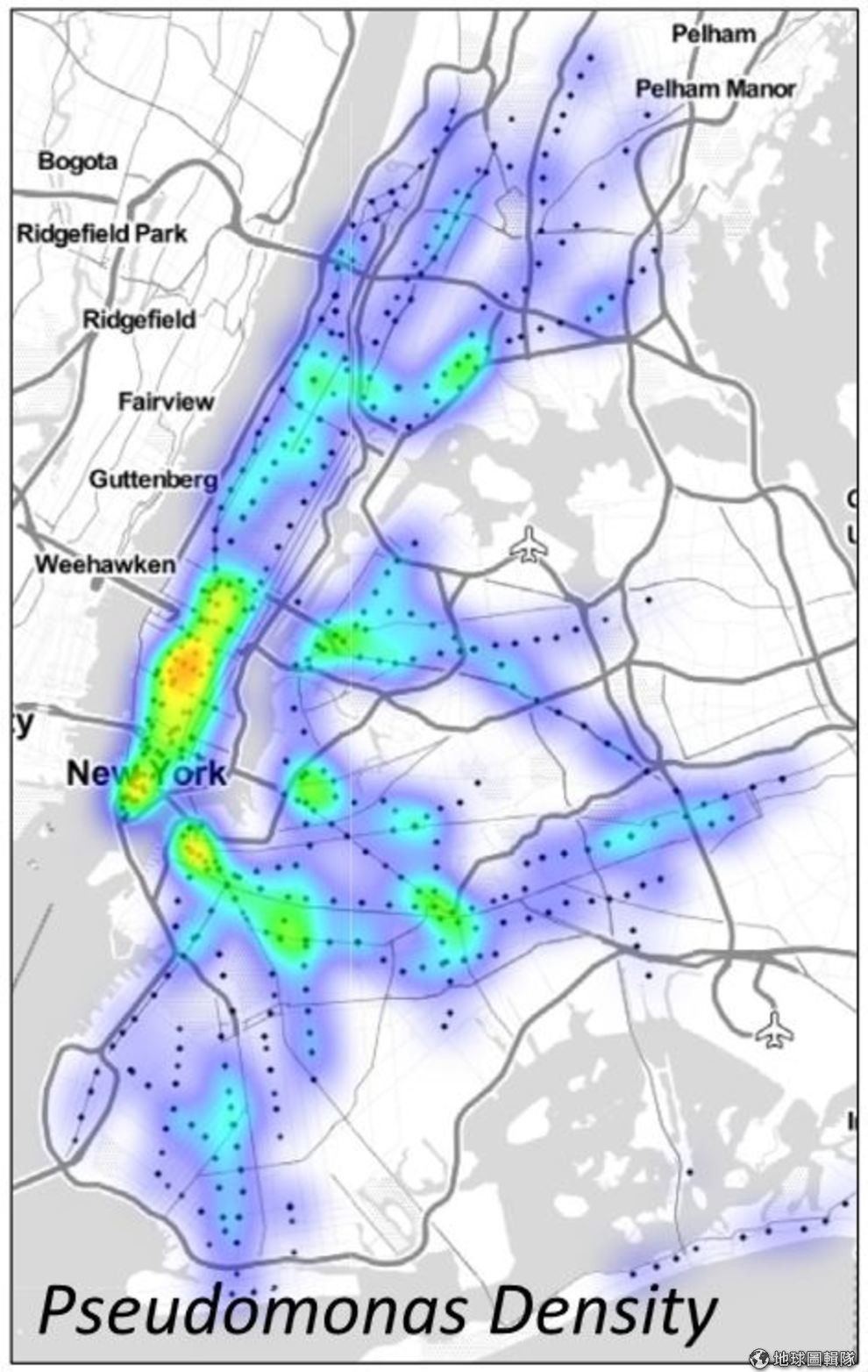 ▲研究顯示出綠膿桿菌的分佈情形(圖片來源:Christopher E. Mason)