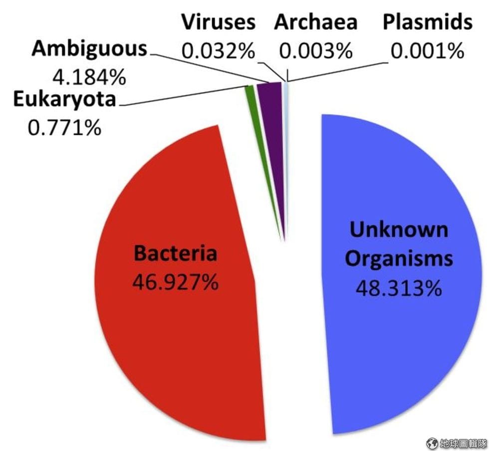 ▲採集的樣本中細菌佔了近 47%,但未知的微生物也佔了 48%。(圖片來源:Christopher E. Mason)