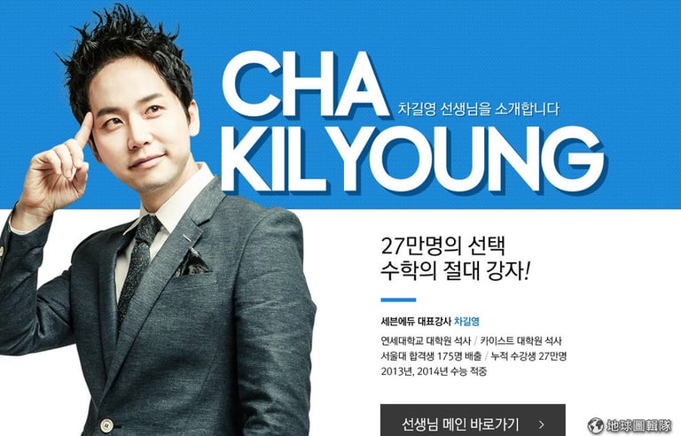 在南韓,「學習」、「教育」可說是人人都瘋狂的議題,而車吉英在當地是炙手可熱的名師,只是他教書的地方不在學校,而是南韓當地一間名叫 SevenEdu的補習班,車吉英專門教授大學入學考中的數學科目。