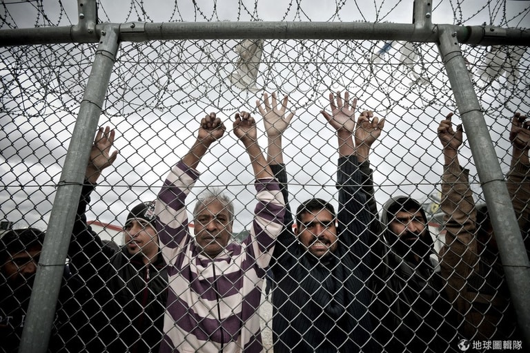 移民站在拘留中心的鐵柵欄前,無助地看著外面。希臘新上任的激進左派聯盟執政黨 Syriza計畫關閉收容非法移民的拘留中心,該計畫被右派政營批評為不人道。