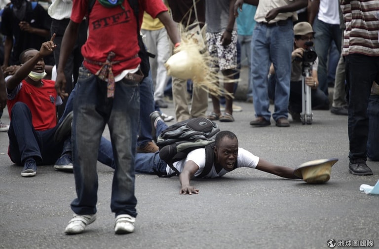 在首都太子港,一名抗議民眾在衝突中跌倒在地,口中仍大聲唸著口號。雖然海地目前正緊鑼密鼓地籌備嘉年華活動,但不少反政府的民眾仍上街示威,凸顯政府深陷政治與經濟困境的無能。警察們也動用催淚瓦斯,希望能驅散示威群眾。