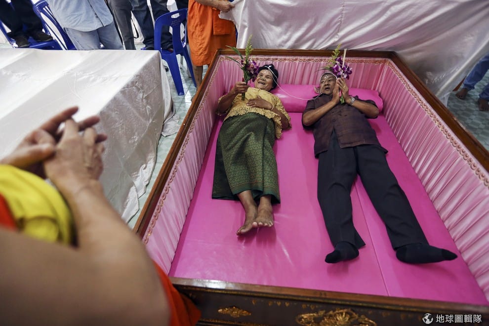 新郎新娘一起在結婚典禮時躺進粉紅色的棺材。這對新人相信,躺進棺材可以趕走壞運,許他們一個幸福美好的未來。
