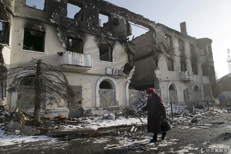 在烏克蘭鄰近頓內次克的一座小鎮,一名女子正默默走過千瘡百孔的建築。