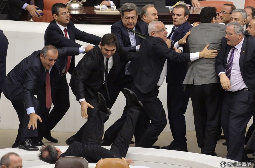 議會衝突一團亂,立法委員打得不可開交。背對鏡頭摔得四腳朝天的是土耳其在野黨共和人民黨(Republican People's Party)的代表杜梓根(Orhan Duzgun),與他同黨的立委和位於畫面右方的執政黨 AK黨立委大動干戈,彼此為了要不要立法增加警察權限毫無共識。該立法案被在野黨大肆砲轟,認為執政黨想要增加警察權力是為了鎮壓示威民眾,企圖把身為北大西洋公約組織一員的土耳其變成一個警察國家。