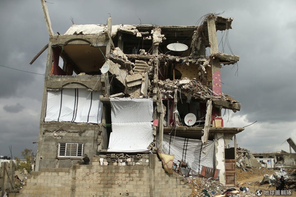 一間破敗不堪的房舍仍直挺挺地立在加薩地區。目擊者指出,巴勒斯坦去年夏天與以色列的 50日戰爭中,不少房舍遭以色列炸毀,到處都是斷垣殘壁,至今仍無法重建,眾多流離失所的巴勒斯坦人只好到難民營尋求幫助。