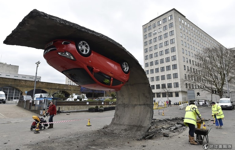 一台紅色汽車顛倒地黏在翻起的道路上,吸引過路人目光。該汽車屬於倫敦裝置藝術的一環,是英國藝術家史尼克(Alex Chinneck)的作品。史尼克表示,這件作品名為「打起精神,振作起來」(Pick yourself up and pull yourself together),將會於目前仍在興建的汽車公園展出一個星期。