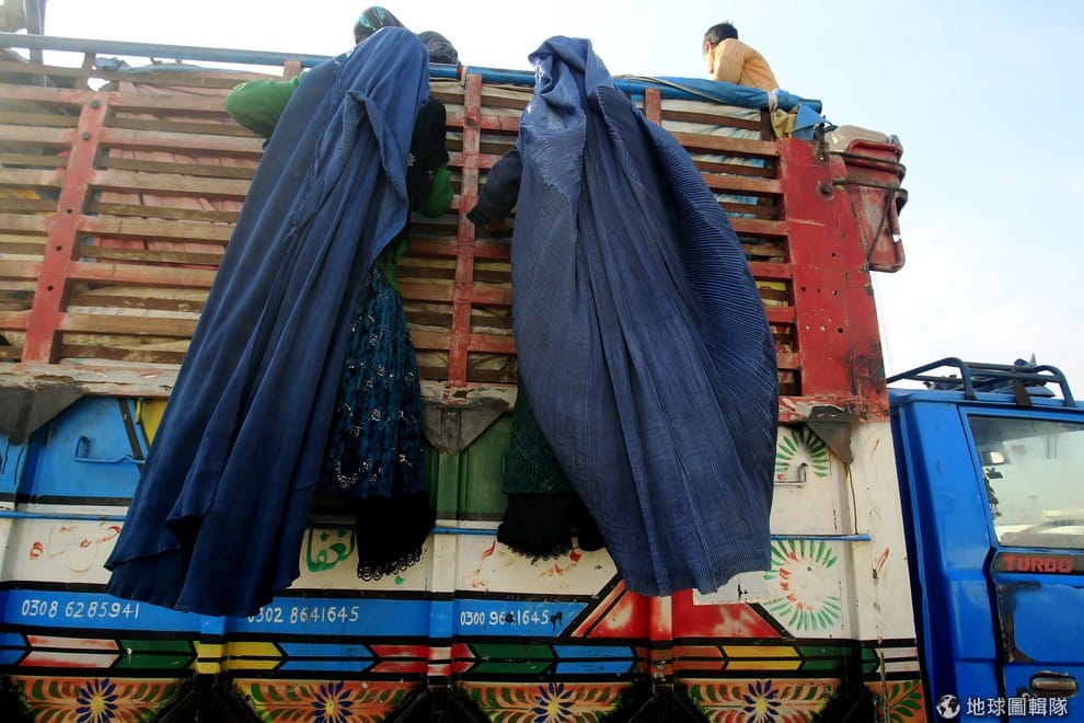 兩名身穿罩袍的阿富汗難民女子掙扎著爬上準備前往阿富汗的卡車。巴基斯坦官方為了剷除武裝分子,近日下令遣返阿富汗移民,外界認為阿富汗移民是代罪羔羊,不過是當局為了分散大眾注意力,為自己無法處理暴力衝突的無能找藉口。上千名待在巴基斯坦的阿富汗移民因為威脅和國內對其升起的敵意,紛紛決定返回阿富汗,拋下原本在阿富汗經營的餐廳、商店與家園。