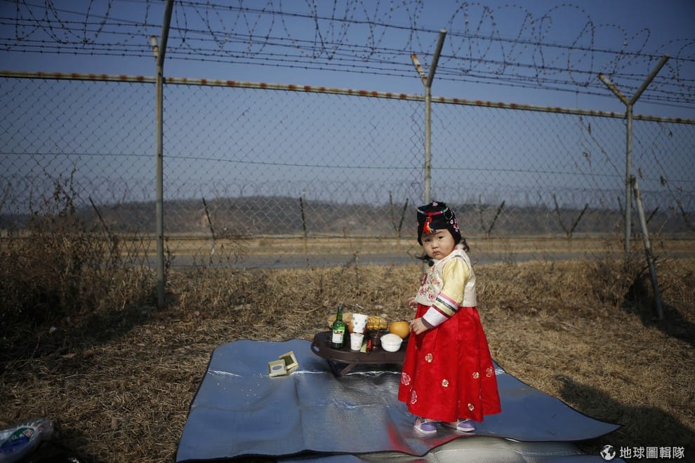 一名身穿傳統韓服的小女孩站在高高的鐵絲網前等著父母。她的父母正為待在北韓的家庭成員準備祭祖的用品。高高的鐵絲網位於兩韓邊界的非軍事區坡州。