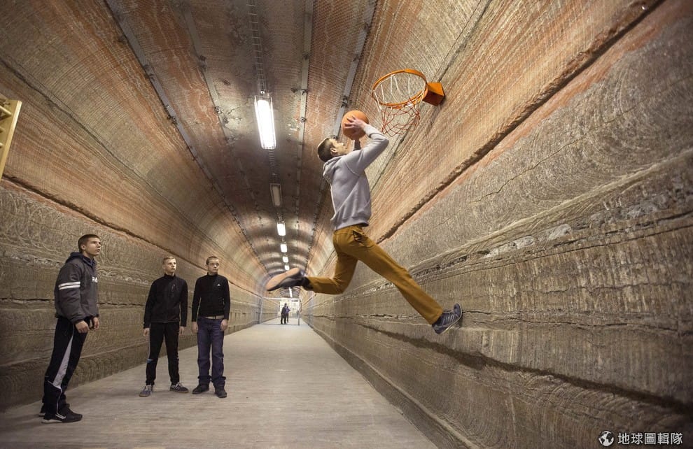 男孩們在位於鹽礦坑中的治療中心打籃球。這群男孩目前正接受洞穴療法(Speleotherapy),即透過在地底礦坑或洞穴中活動調節身心。根據白俄羅斯國家治療中心的統計,每年有超過 7,000名小孩和成人來到地底鹽礦坑治療呼吸系統疾病,該礦坑距離地面 420公尺。