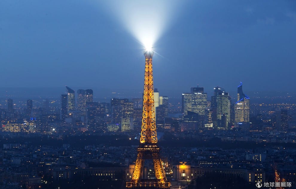 巴黎著名地標艾菲爾鐵塔在夜空中閃閃發亮。五架無人機飛過巴黎這些敏感地點包含美國大使館,造成民眾恐慌。目前法國當局正深入調查,三名《半島電台》記者遭逮補,警方認為他們就是在幕後操縱無人機的人。