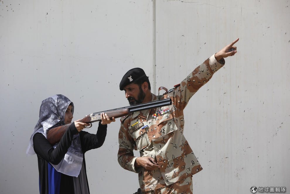 一名巴基斯坦巡邏部隊軍人正在指導一名女大生用槍。近日,超過 200名大學生造訪位於喀拉蚩外圍的巡邏部隊射擊和騎術俱樂部(Rangers Shooting & Saddle Club, RSSC),觀看反恐培訓示範。