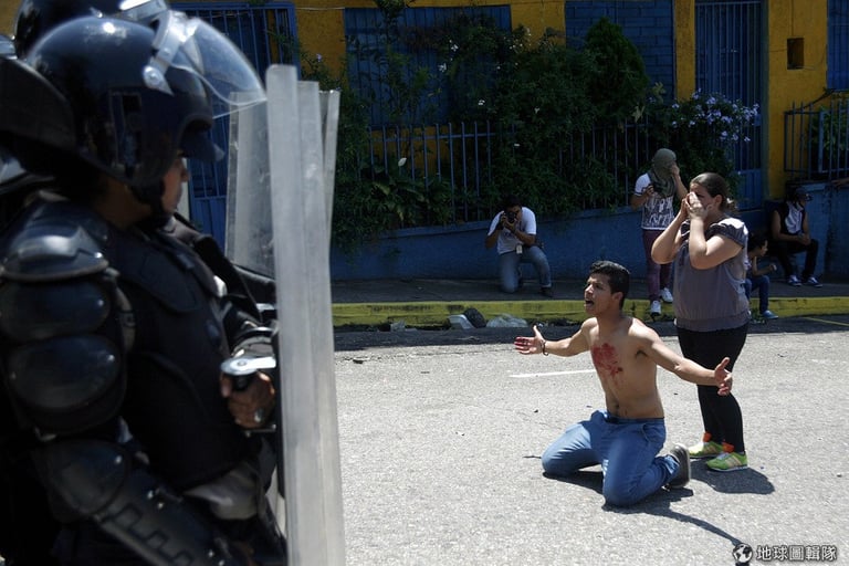 年僅 14歲的學生羅亞(Kluiver Roa)上街抗議身亡後,一名少年胸前淌著血,跪在鎮暴警察的盾牌前。24號時,羅亞在委內瑞拉西部城市聖克里斯托瓦爾抗議政府無能造成經濟危機,政府馬上派出警察鎮壓,造成羅亞在示威中身亡,目前羅亞的死因仍待進一步調查。