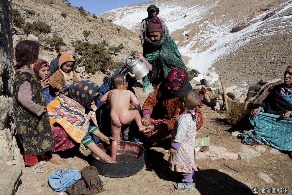 生活在摩洛哥高阿特拉斯山脈山腳下的柏柏族女人正手忙腳亂地在幫小孩洗澡。多個柏柏人群居的村落就坐落在山腳下,他們靠著農耕、用傳統烤爐烤麵包、放牧、自製蜂蜜、橄欖油和陶器出售維生。聯合國表示,極端天氣造成淹水和土石流,影響了柏柏人的農業生產力。