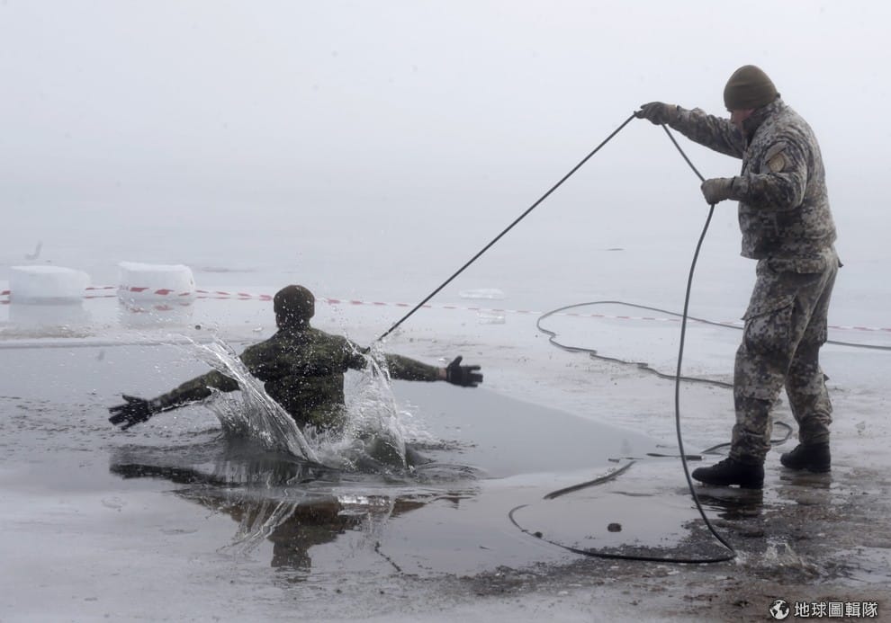 一名因北大西洋公約組織(NATO)行動任務派駐在拉脫維亞的加拿大軍人,和同伴一起在聯合軍事演習中進行破冰訓練。